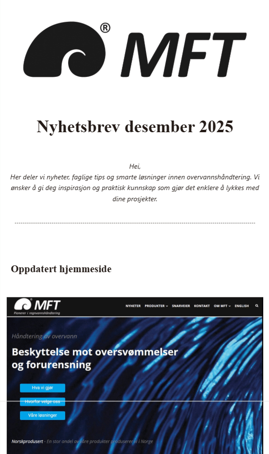 Våre nyhetsbrev utgis uregelmessig, maksimalt 4 ganger per år. Nyhetsbrevene distribueres elektronisk via epost. Her presenterer vi nytt om MFT, produkter, eksempler på løsninger og aktuelle bransjetemaer. Vi tar gjerne imot innspill!