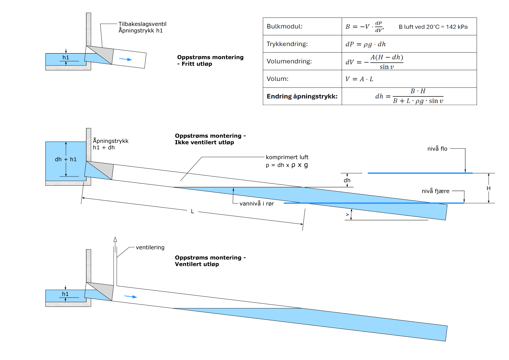 Ved oppstrøms montering av tilbakeslagsventil, bør behovet for ventilering av rørstrekket nedstrøms tilbakeslagsventilen vurderes. Uten ventilering vil luft som fanges i rørstrekket nedstrøms ventilen komprimeres ved endring av vannivået i resipienten. Luftrykket vil virke på ventilen, og kreve økt oppstrøms trykk for at den åpner og slipper vann ut (differansen mellom oppstrøms og nedstrøms trykk må overstige oppgitte åpningstrykk). Effekten av lufttrykk i røret kan beregnes ved hjelp av Bulk modulen, og påvirkes av rørvolum, fall og nivåforskjell mellom flo og fjære. Ved visse forhold kan effekten på åpningstrykket være markant.
