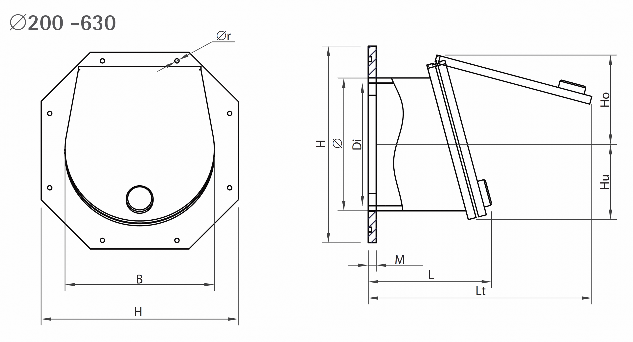 | Produktnr | DN | Ø | H | Di | B | M | L | Lt | Ho | Hu | Vekt [kg] | Rørtype |